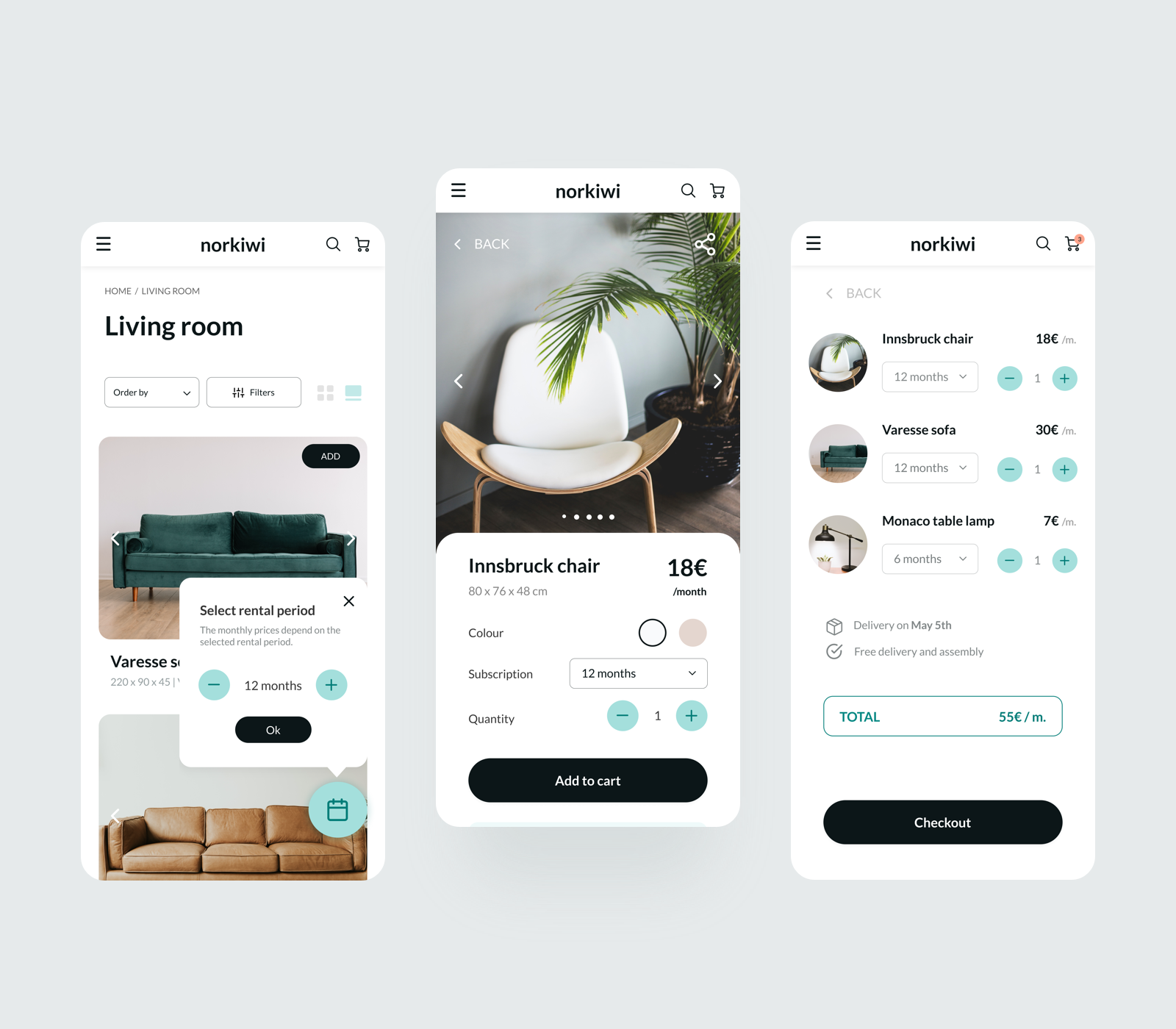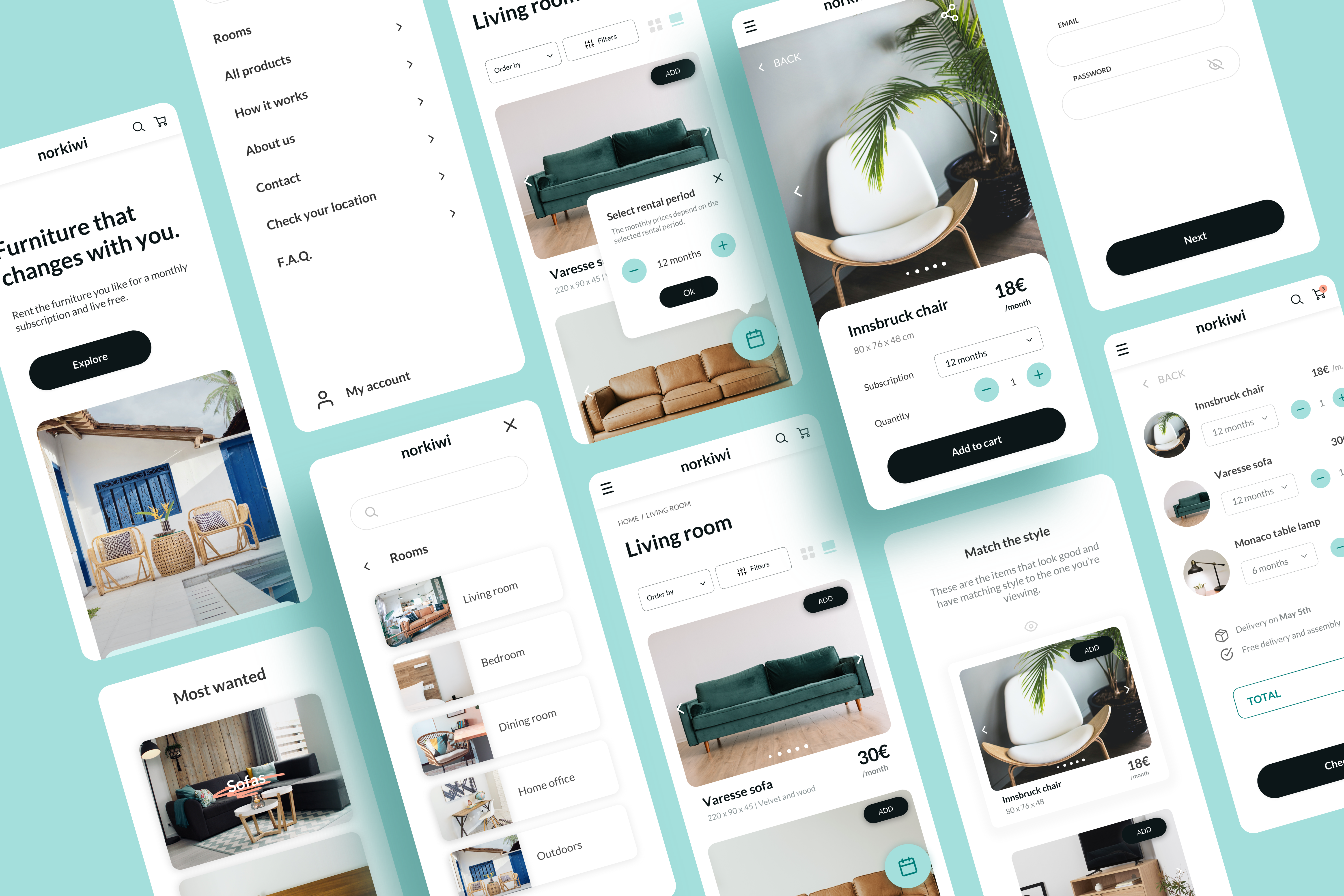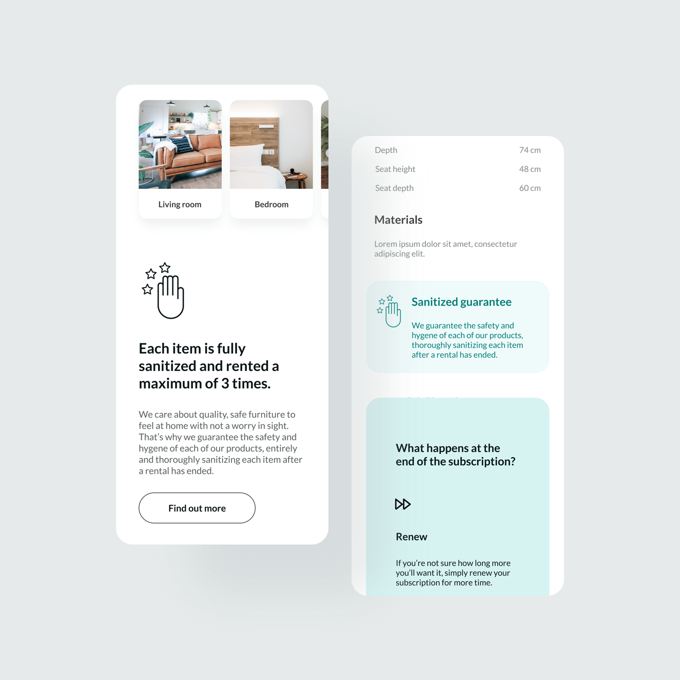 Simplicity: clean interface, where the furniture photos are the main focus doing an emphasis on design. It’s also a way to distinguish from “conventional” furniture e-commerces and conveying the idea that furniture rental is the future and as easy and fast as you’d imagine.