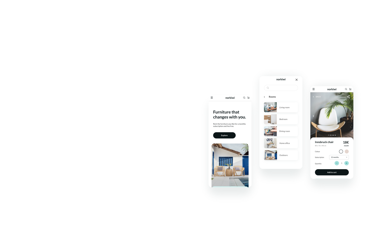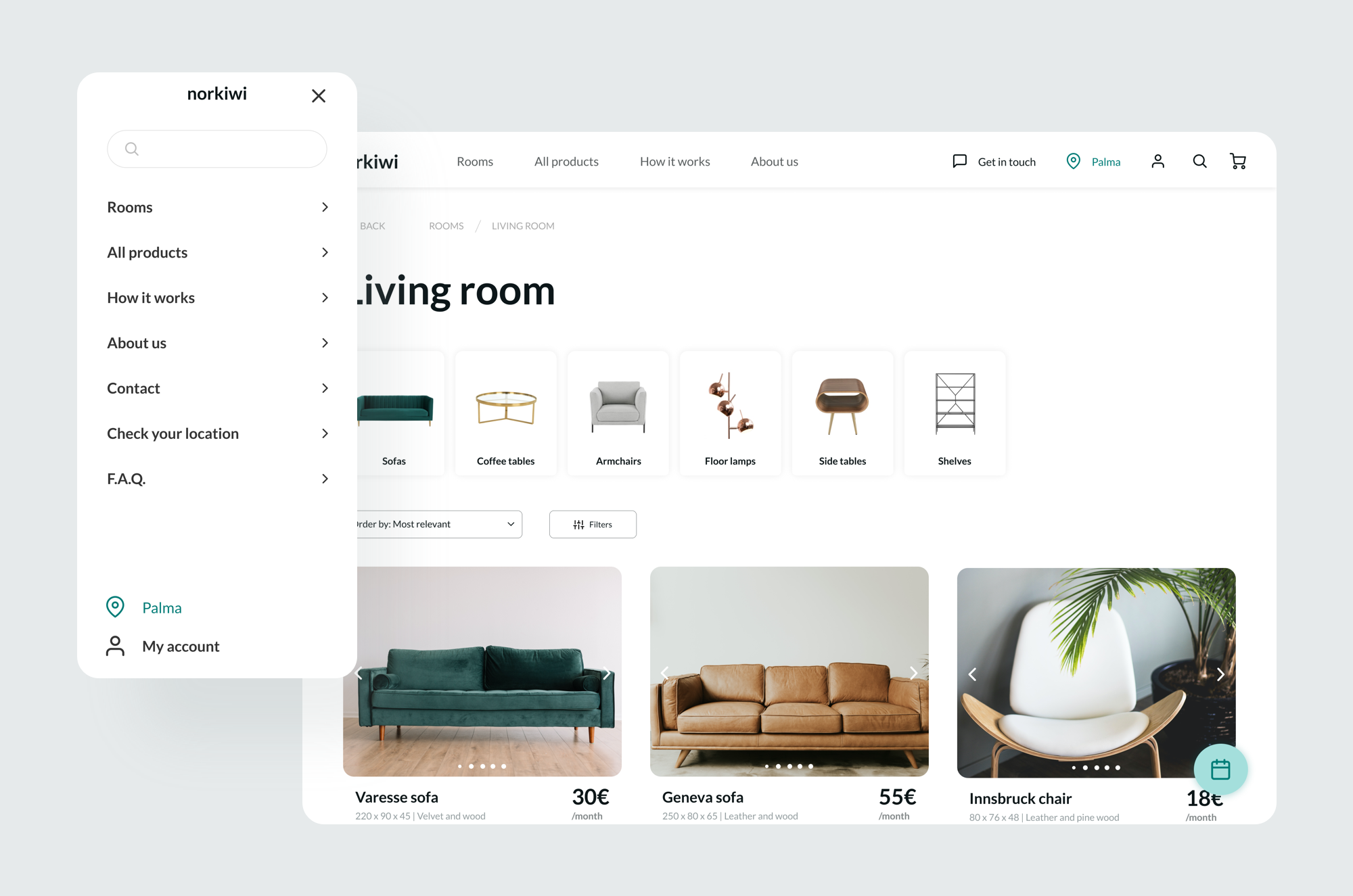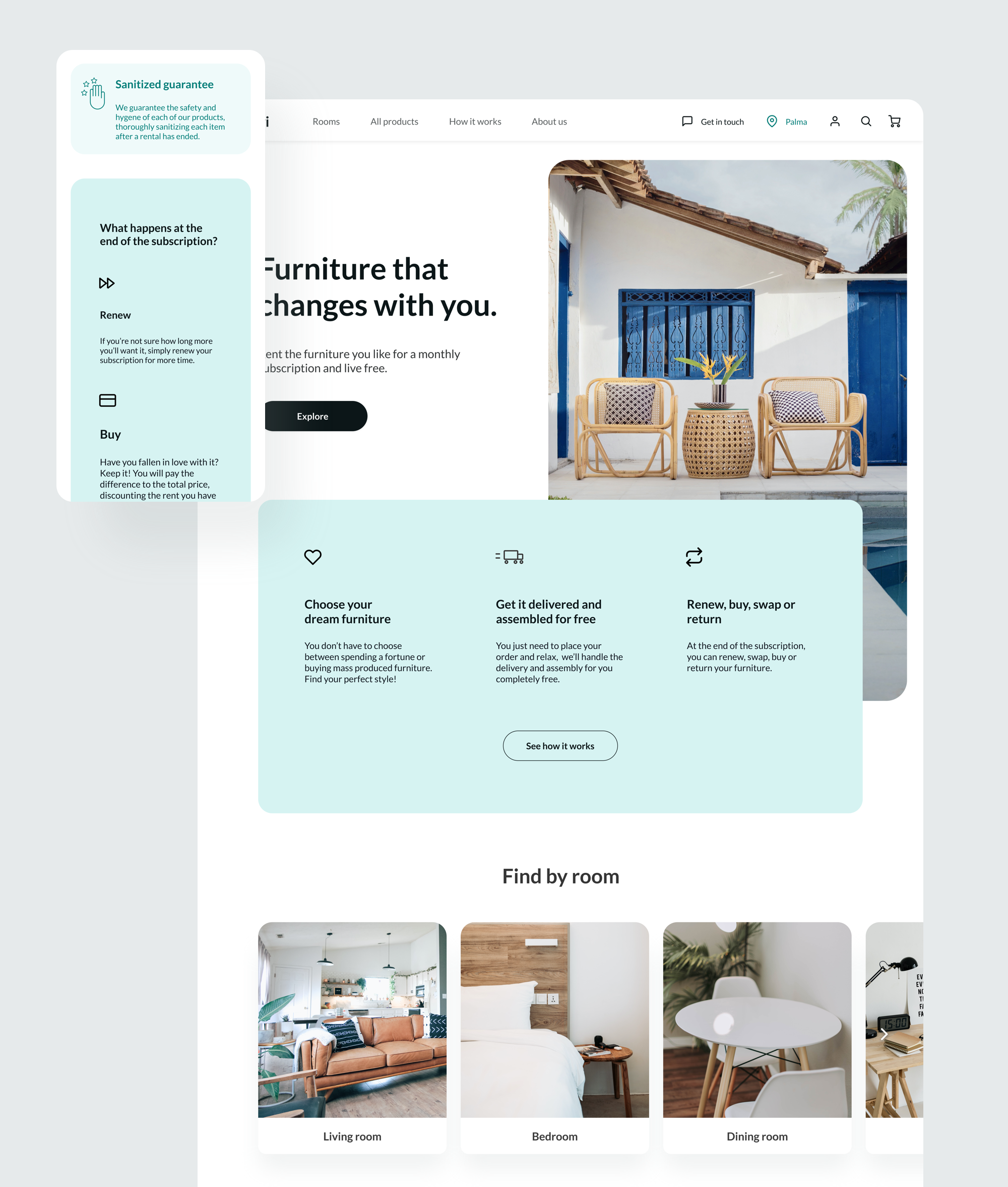 Simplicity: clean interface, where the furniture photos are the main focus doing an emphasis on design. It’s also a way to distinguish from “conventional” furniture e-commerces and conveying the idea that furniture rental is the future and as easy and fast as you’d imagine.