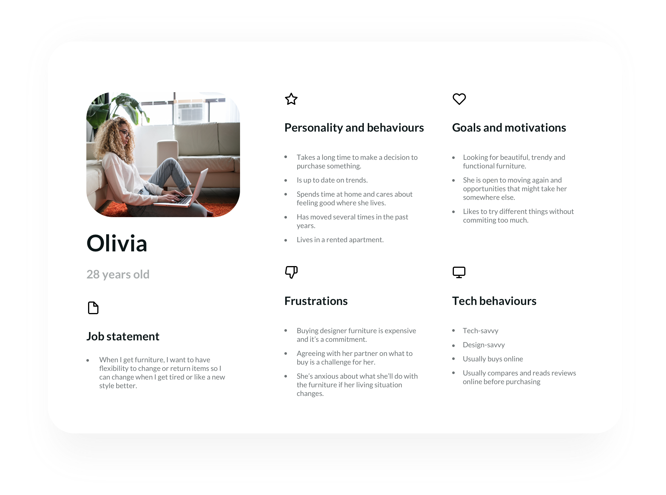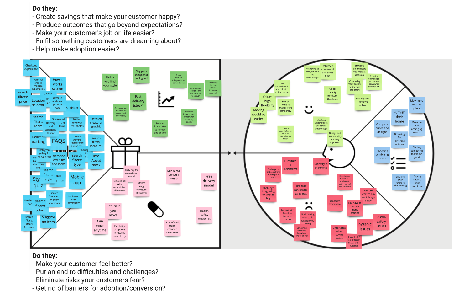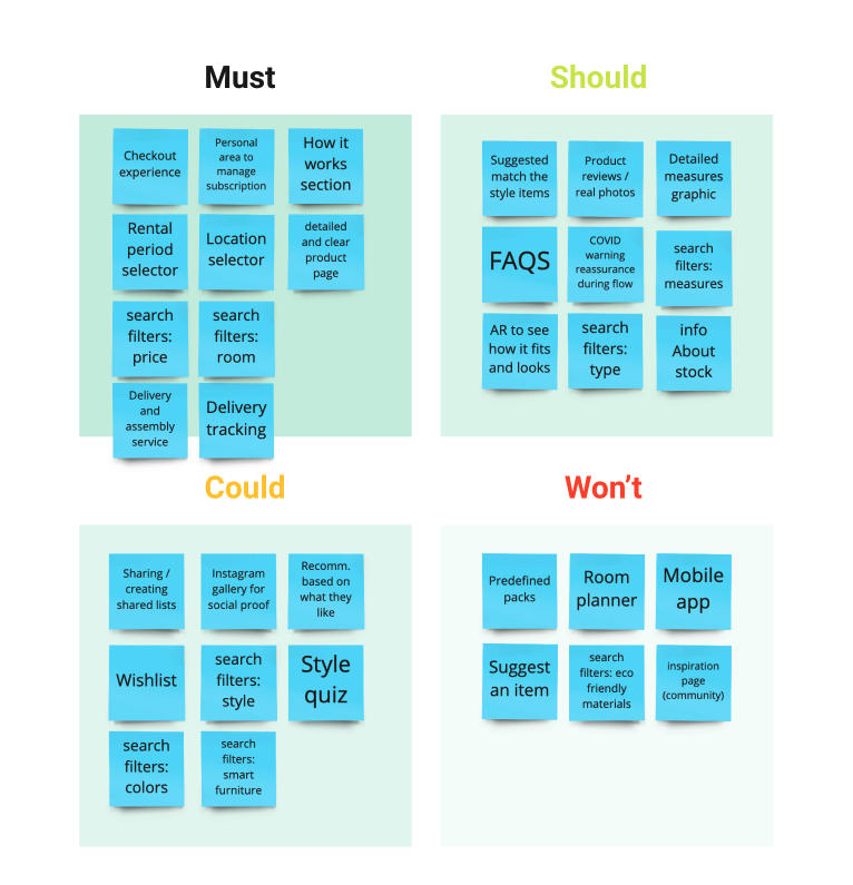 For example, in my research I discovered seeing the product physically and how the product looks and feels in the room influences the decision a lot, and an AR feature that lets them view the product in their room would be a delighter for them, but it’s likely it has a really high development cost and would delay getting the product into the hands of the users as soon as possible.